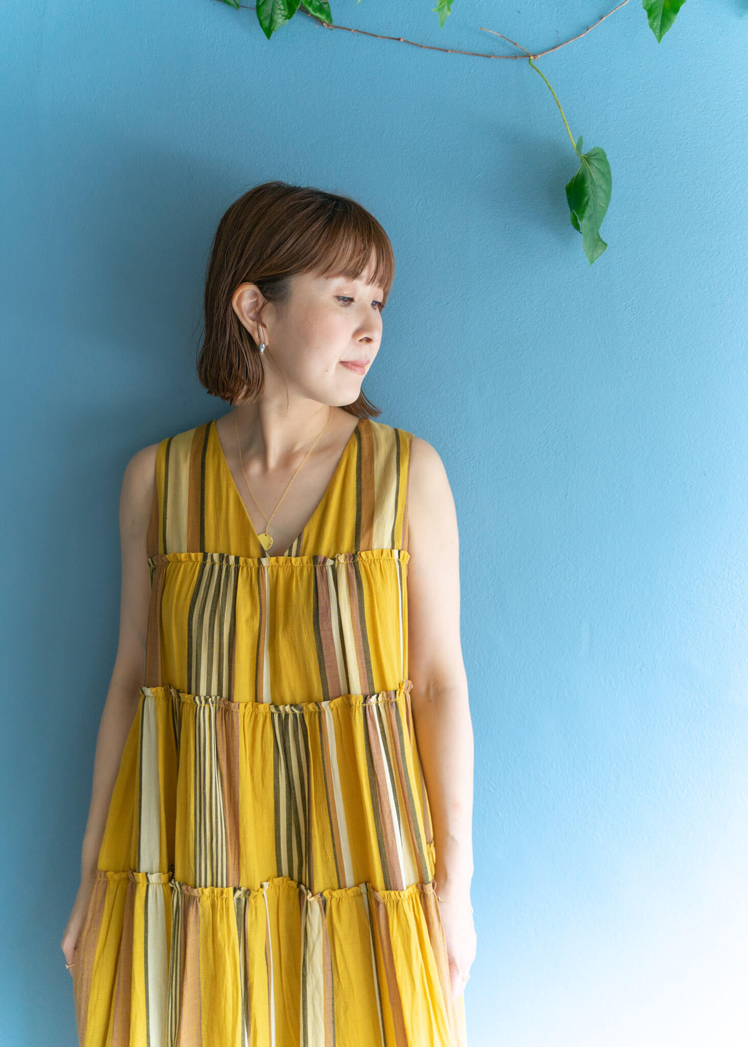 ティアードシルエットのデザインは分量感がありつつ、縦のラインを強調するストライプ使いなのですっきりと見えるのも嬉しいポイント。切り替え部分にはミニフリルを飾って華やかさをプラスしています。腕がキレイに見えるようアームホールのパターンにもこだわっているので、ノースリーブが苦手…という方にもおすすめのワンピースです。肌寒くなってきたら、薄手のインナーを合わせたり、羽織ものなどを上から重ねてコーディネートを楽しんでみてくださいね。