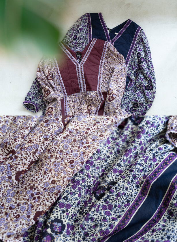 軽く柔らかな風合いのコットンボイル生地に、ヴィンテージファブリックにインスパイアされた〈ne Quittez pas〉オリジナルの花柄をプリント。シックな秋色を取り入れた、甘くなりすぎない花柄に仕上がっています。