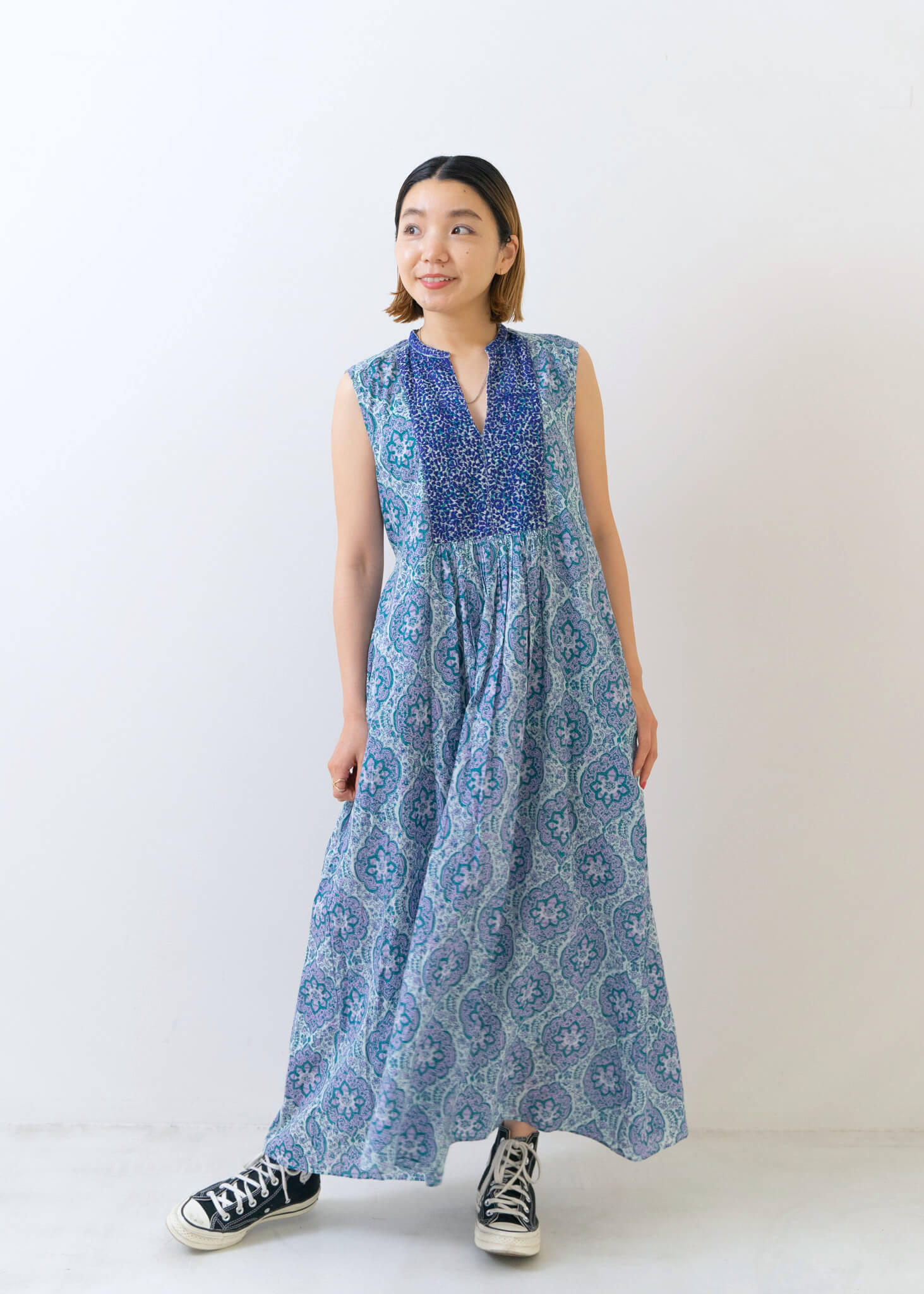 カラーはGreen、Mustard、Blueのアラベスク模様をプリントした3色をご用意しました。着心地の良いコットンボイルの布地にプリントされていて、パキッとしすぎないトーンに仕上げた事で肌馴染みも良く、大人の装いを楽しんでいただけます。胸元には各色に合った糸で贅沢に刺しゅうをあしらい、大胆な色彩センスで単調にならないバランスを作ってくれています。刺しゅうのデコレーションが目線を上げてくれるので、スタイルアップ効果も期待できますよ。